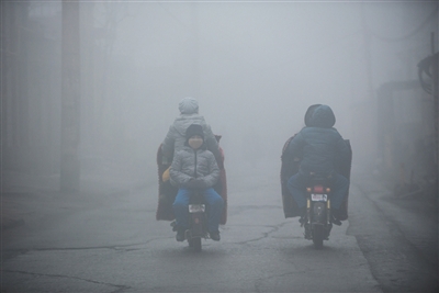 2016年12月22日7时45分,邯郸市区,一名学生倒坐在行驶的电瓶车上。当天早上,邯郸依旧笼罩在雾霾之中。