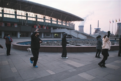 2016年12月23日早晨7时,在河北武安体育中心,市民在广场上晨练。一条马路之隔的是武安文安钢铁厂区。
