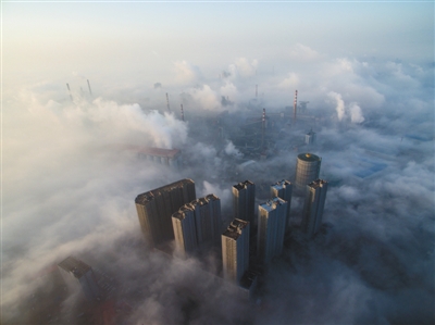 2016年12月22日早晨八时,从邯郸市建设大街附近的高空向南俯瞰,居民区的高层建筑和钢铁厂区的烟囱穿过晨雾。