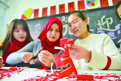 1月1日,山东聊城大学美术学院大学生志愿者和留学生一起学习传统文化剪纸艺术,欢庆新年。赵玉国摄/光明图片
