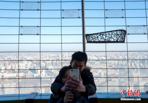 1月2日,雾霾暂别北京,蓝天重现,一对年轻人登上中央电视塔观景台自拍美景。中新社记者 侯宇 摄