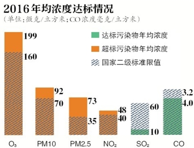 通报显示,2016年,北京二氧化氮年均浓度为48微克/立方米,年度改善率仅为4.0%,仍超过国家标准20%。