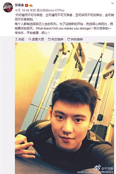 元旦当天,宁泽涛发了一条新年微博。昨晚,他再次更新微博(下小图)。这次他不再是简单的新年祝福,而是引用古言明志,并表示“每个人都有选择自己人生的权利”,这被解读为其已疑与中国游泳队决裂。
