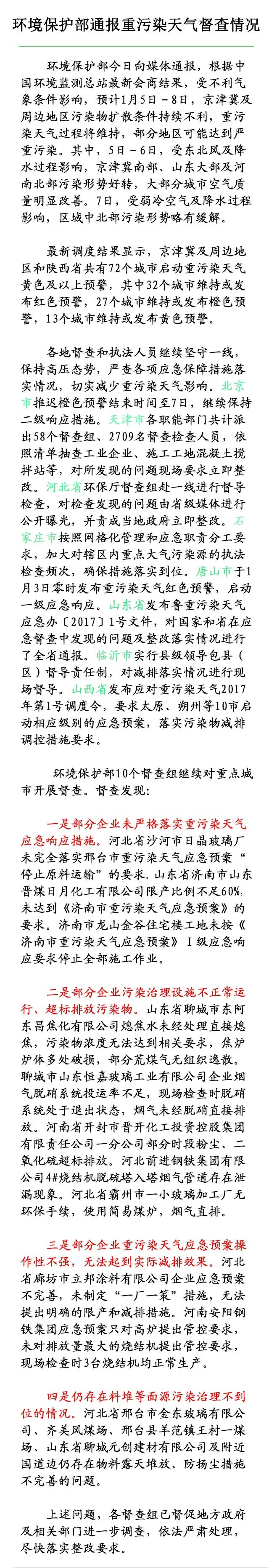 督查发现,部分企业未严格落实重污染天气应急响应措施,部分企业污染治理设施不正常运行、超标排放污染物,部分企业重污染天气应急预案操作性不强,一些地方仍存在料堆等面源污染治理不到位的情况。