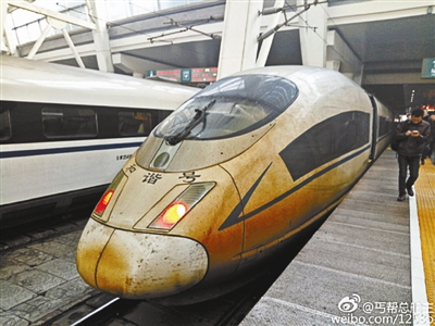 1月2日,网上一篇名为《这是一辆穿过雾霾区的高铁》的文章称,一列从上海开往北京南站的高铁,在穿越华东、华北全部重雾霾区后未经雨水冲刷,尘埃布满车身。