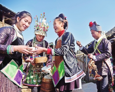 苗年通常称为“大年”,是从江县当地苗族最大的节日。苗年不是一个统一的节日,各地区有不同的过节形式和时间,通常从农历十月中旬起,各地区依习惯顺序过年。苗年期间,在外乡的人也都赶回家探亲访友,并举行丰富多彩的传统文化活动。图为村民相互串门吃百家饭年俗。