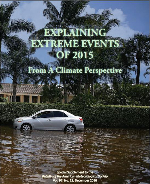 2016年12月15日,由美国、英国和中国等18国的116名科学家发表题为《从气候角度解释极端事件》的报告。报告显示,从东亚的热浪,到阿拉斯加的野火,再到英国冬季的极端长时日照,2015年多个极端天气事件均与人类活动引起的气候变化有关。报告显示,2015年发生的10起极端高温天气事件,包括在欧洲、印度、巴基斯坦、中国、印度尼西亚和澳大利亚发生的热浪,都因气候变化而变得更加剧烈;去年3月北极海冰面积创新低以及阿拉斯加大面积野火,也都受气候变化的影响。此外,美国迈阿密地区在晴朗天气发生潮汐性洪水的概率自1994年以来增加到500%以上;像英国2015年那样发生极长冬季日照的概率也因气候变化增加到1.5倍。但2015年的另外一些极端天气事件与气候变化没有必然关系,包括尼日利亚春天雨季推迟、印度金奈的百年最强降雨以及美国东北部与加拿大的冬季极寒天气等。
