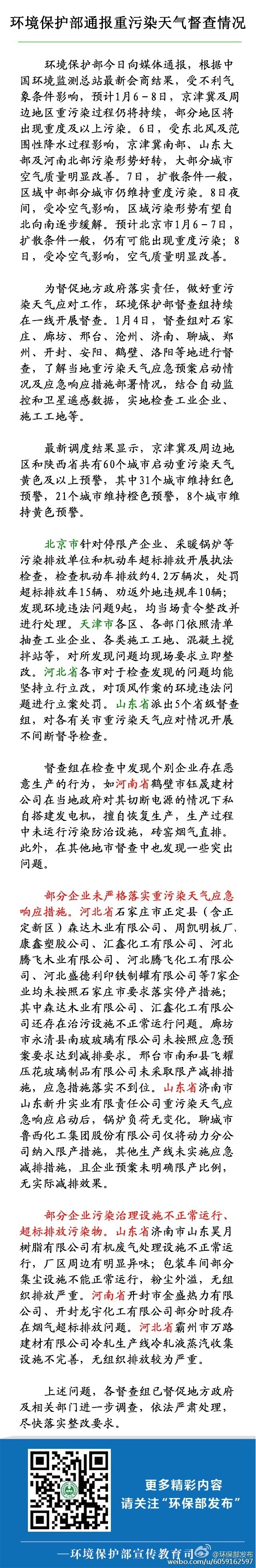 环保部督查组持续在各地开展督查,了解当地重污染天气应急响应措施落实情况。督查发现个别企业存在恶意生产的行为,部分企业未严格落实重污染天气应急响应措施,部分企业污染治理设施不正常运行、超标排放污染物等。