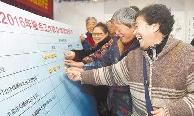 1月5日,安徽省合肥市瑶海区胜利路街道建设社区举行“2016年服务群众重点工作满意度测评”活动。活动中,该社区将一年来服务居民群众的重点工作逐一列项,邀请群众用贴“笑脸”的方式,进行满意度测评。