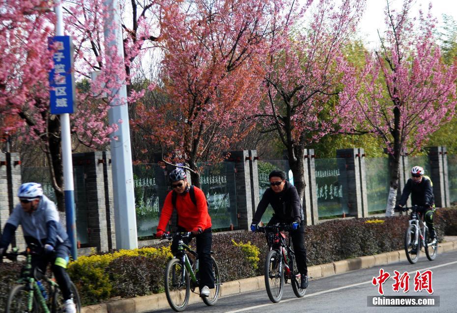1月7日,在红塔西路樱花树下骑行的民众。红塔西路是昆明目前冬樱花最集中的一条景观大道,在长达1.9公里的道路两侧有600余株冬樱花,吸引众多市民前往观赏。中新社记者 李进红 摄