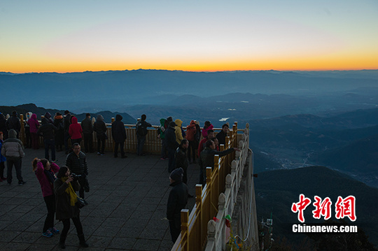 1月8日,各地游客聚集在云南大理宾川鸡足山顶,观赏日出美景。鸡足山是享誉南亚、东南亚的佛教圣地,是中国十大佛教名山之一。
