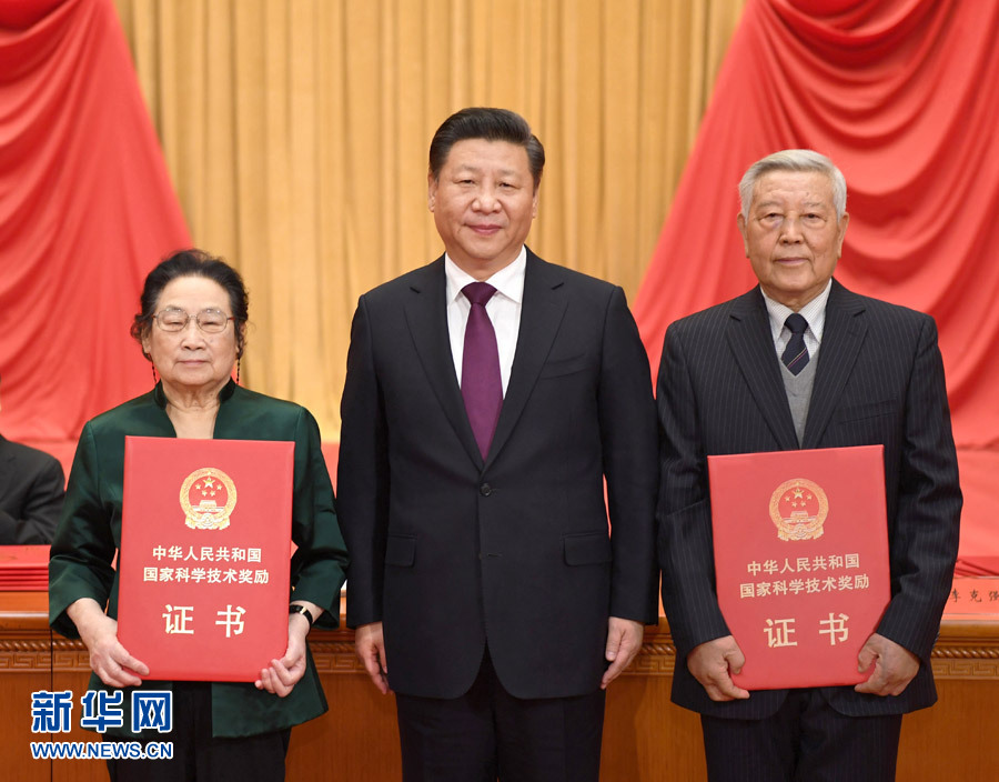 1月9日,2016年度国家科学技术奖励大会在北京人民大会堂隆重举行。中共中央总书记、国家主席、中央军委主席习近平向获得2016年度国家最高科学技术奖的中国科学院物理研究所赵忠贤院士(右)和中国中医科学院屠呦呦研究员(左)颁奖。新华社记者 李学仁 摄