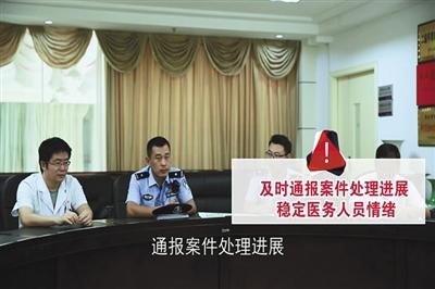 当发生殴打、侮辱医务人员等行为时,民警在处置的同时,也要及时通报案件处理进展,稳定医务人员情绪。