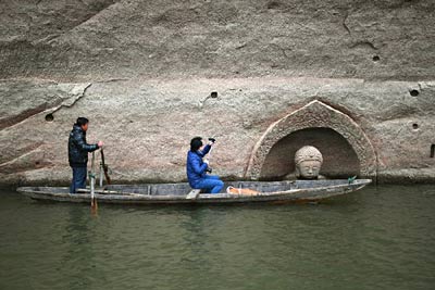 考古人员在对露出水面的佛头进行拍摄(1月8日摄)。 2016年底,位于江西省抚州市南城县的洪门水库水位显著降低,一尊佛头和一些被淹没的遗迹浮出水面。考古专家根据露出水面的佛头造型,初步判断为明代佛像;崖壁凿刻痕迹中有一些方形的孔,说明此处可能曾建有庙宇。目前,国家文物局水下文化遗产保护中心专业考古队正在对洪门水库摩崖造像周围水域进行水下考古探测。