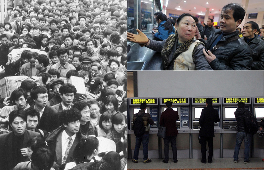 左图:渴望与家人团聚的旅客在广州火车站站前广场排起长龙(1995年1月11日摄)。新华社记者 陈学思 / 右上图:长沙火车站售票窗口前,旅客王海燕得知想要购买的长沙至广州的卧铺车票已经售完,倍感无奈(2013年1月29日摄)。 新华社记者 李尕 摄 / 右下图 2016年12月15日,旅客在江苏苏州火车站自助售票机上购买火车票。(王建康摄)