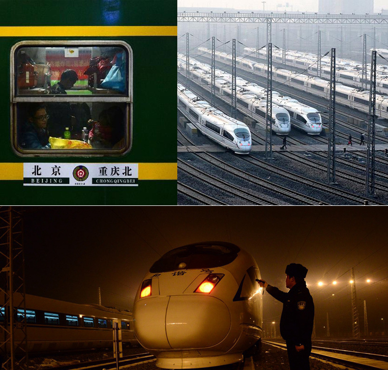 左上图:2015年2月12日,3603次临客列车停靠在北京火车站。新华社记者 王晓 摄 / 右上图:1月23日,动车组列车在上海铁路局上海动车段内准备投入运营。 新华社发 (陈飞 摄)/ 下图:在吉林的动车库,民警守护动车入库。(图片来源:新华网)