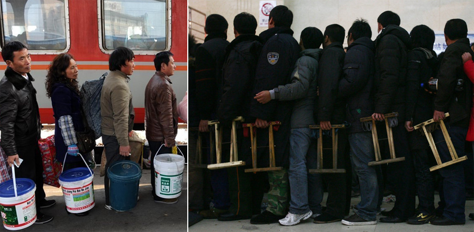 左图:2011年1月21日,在浙江嘉兴火车站,一队衣着鲜亮的安徽籍务工人员,分别拎着油漆桶或涂料桶,排队上车。(图片来源:CFP)/ 右图:2009年1月9日,在青岛火车站买票的旅客手里都提着一个马扎。(图片来源:CFP)