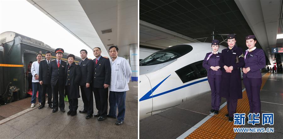 左图:2月2日拍摄的K4249次列车乘务人员;右图:2月3日拍摄的G1327次列车乘务人员(拼版照片)。新华社记者 丁汀 摄