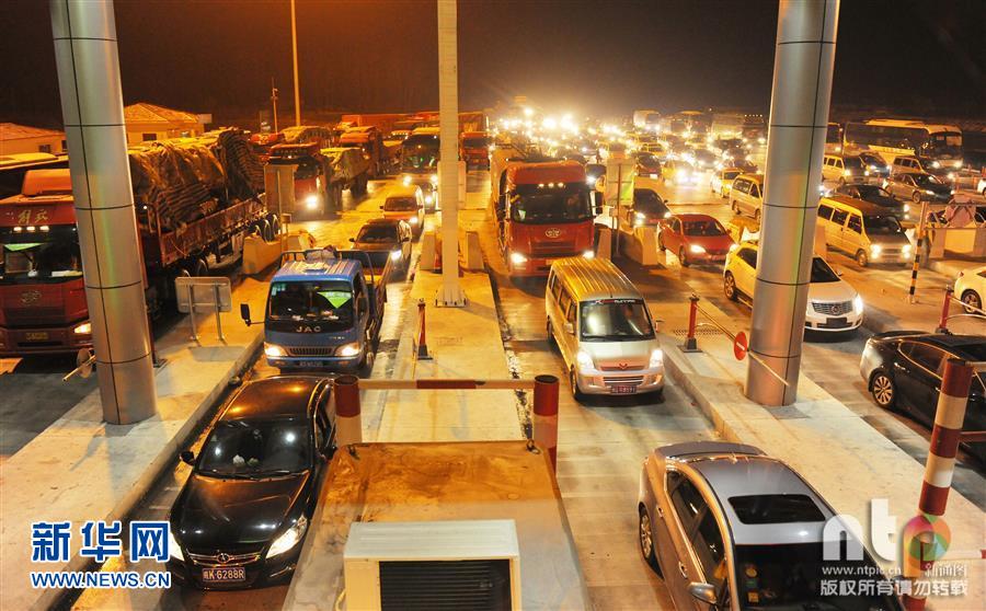 2016年2月3日晚,在国内最大高速公路收费站——安徽省全椒县境内的合宁高速吴庄收费站,大批车辆缓慢通行进入安徽。