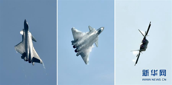 2016年11月1日,参加第十一届中国航展的歼-20飞机进行飞行展示(拼版照片)。新华社记者 梁旭 摄