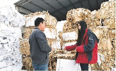 这是桂博文的废品回收站,她(右)正与工作人员交谈工作事宜。