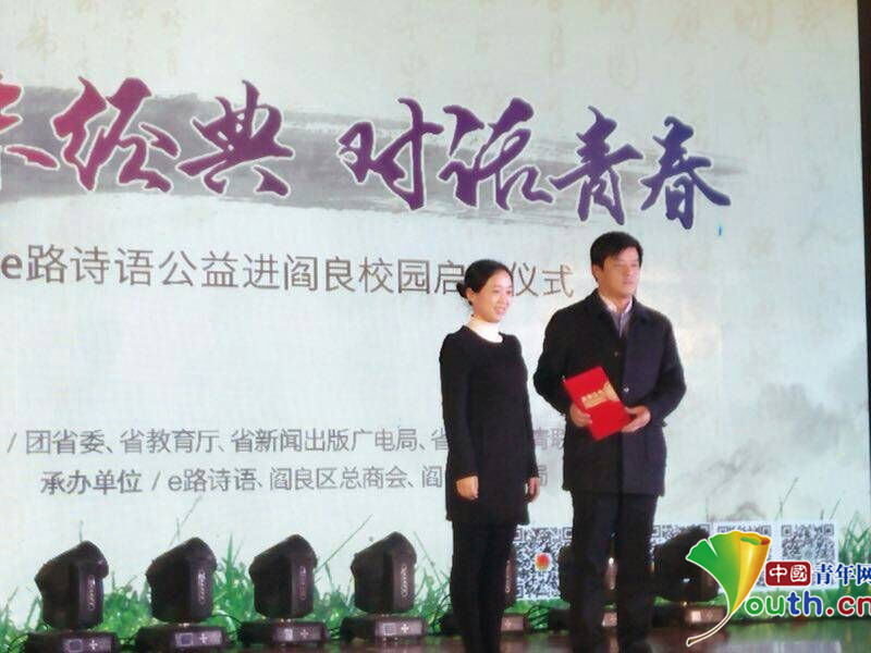 中国青年网北京1月14日电 (记者 刘芊芊) 2017年1月12日,“品味经典 对话青春”e路诗语进百校系列活动之公益走进阎良学校,在陕西团省委、省教育厅、省新闻出版广电局、省文联、省青联、省少工委的主办下,在阎良区总商会的大力支持下正式启动。