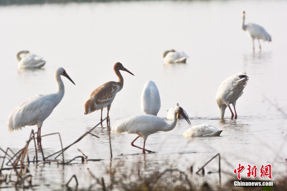 1月13日,江西鄱阳湖畔的五星垦殖场,许多在此越冬的白鹤等珍禽候鸟嬉戏觅食。据了解,每年占世界总数95%以上的白鹤、50%的白枕鹤、60%的鸿雁都在被誉为“候鸟天堂”的鄱阳湖区越冬。每年这个季节,也会有很多喜爱候鸟的游客及摄影爱好者在此观鸟和拍摄。