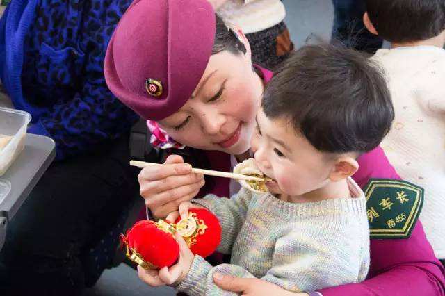 小旅客车上哭闹,谢安平将自己的晚餐——饺子喂给他吃。