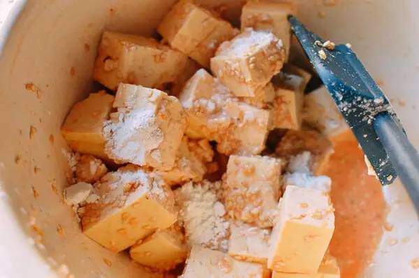 1、将糖、醋、酱油溶解在一个碗里备用。然后豆腐切成小立方体,裹上淀粉。