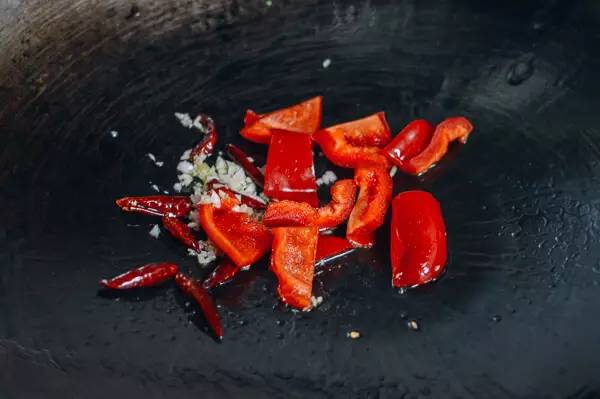 5、将火调至中火,加入1汤匙油,再加入姜末,10秒钟后加入蒜末、干辣椒、红灯椒、绍兴酒。