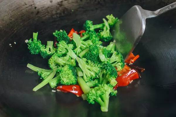 6、15秒后加入水或者蔬菜高汤,然后等整个汁水沸腾后加入西兰花。