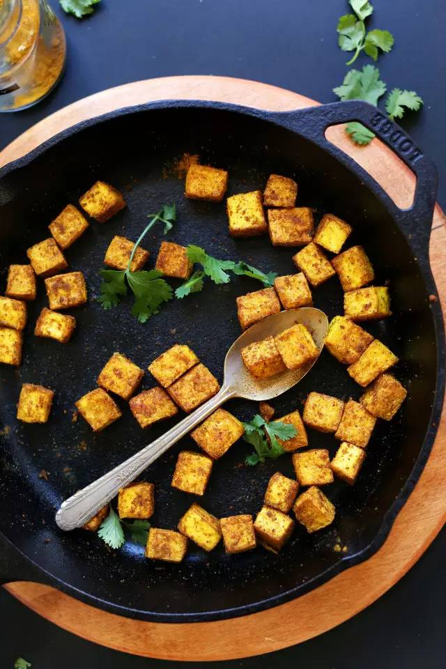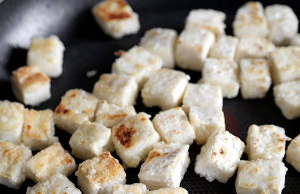 2、将油加热,将豆腐煎至各面金黄(约7分钟),然后将豆腐转移到盘子里备用。