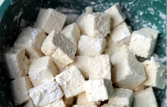 2、撒上玉米淀粉,如果豆腐还是很湿,就多加一些玉米淀粉。