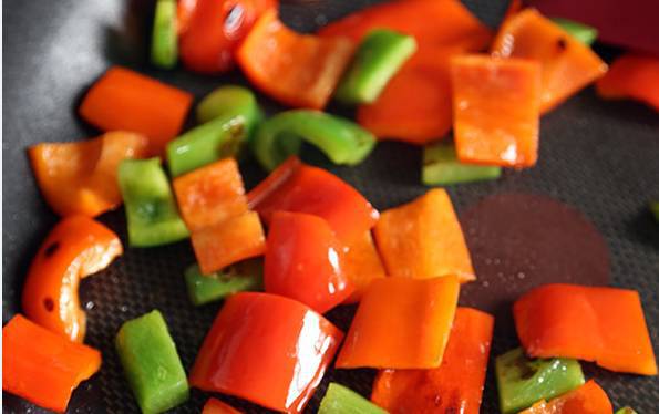 3、将红色和绿色甜椒放到锅里煮4分钟,直到辣椒软化。