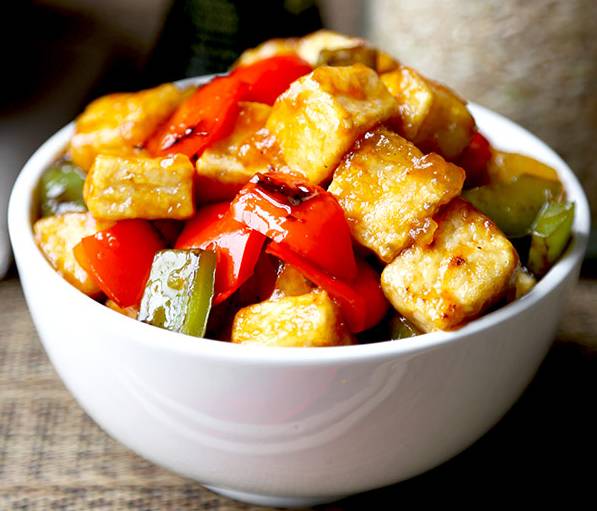 材料: 豆腐一块、糖一勺、醋一勺、红色和绿色甜椒各一个、马铃薯淀粉半碗、盐一勺、酱油半勺、鸡精一勺