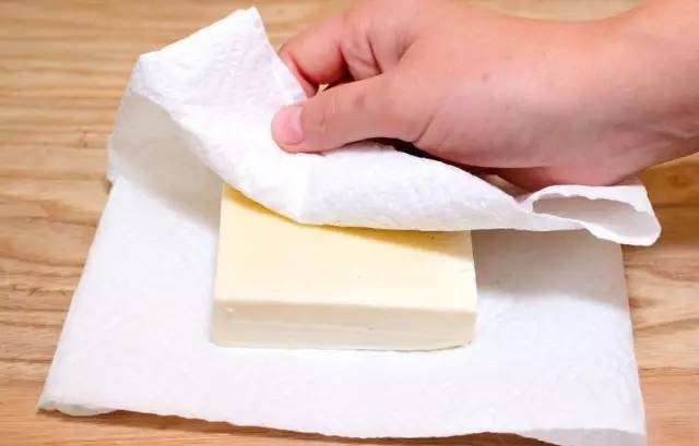 2、用餐巾纸吸干豆腐水分,静置5分钟左右。