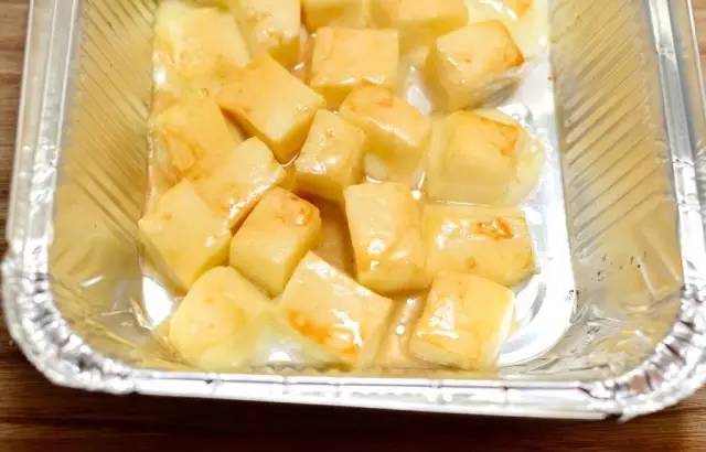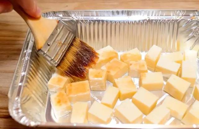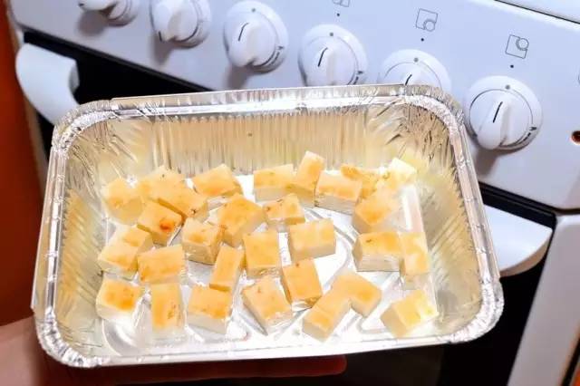6、将豆腐放进烤箱烘烤15分钟,待豆腐变硬且呈金黄色时取出。
