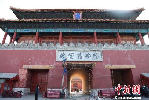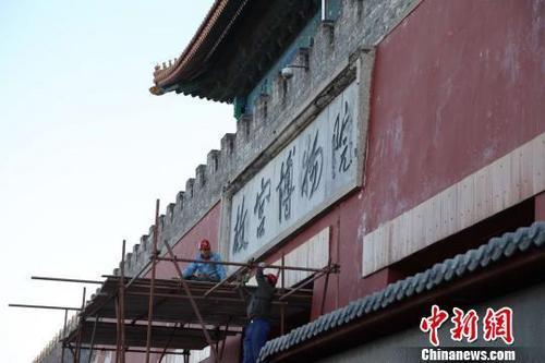 20日来故宫博物院参观的游客在从神武门离去时,会发现神武门口搭起了脚手架。故宫20日向媒体公布,这是在修缮部分边框脱落的“故宫博物院”匾额。