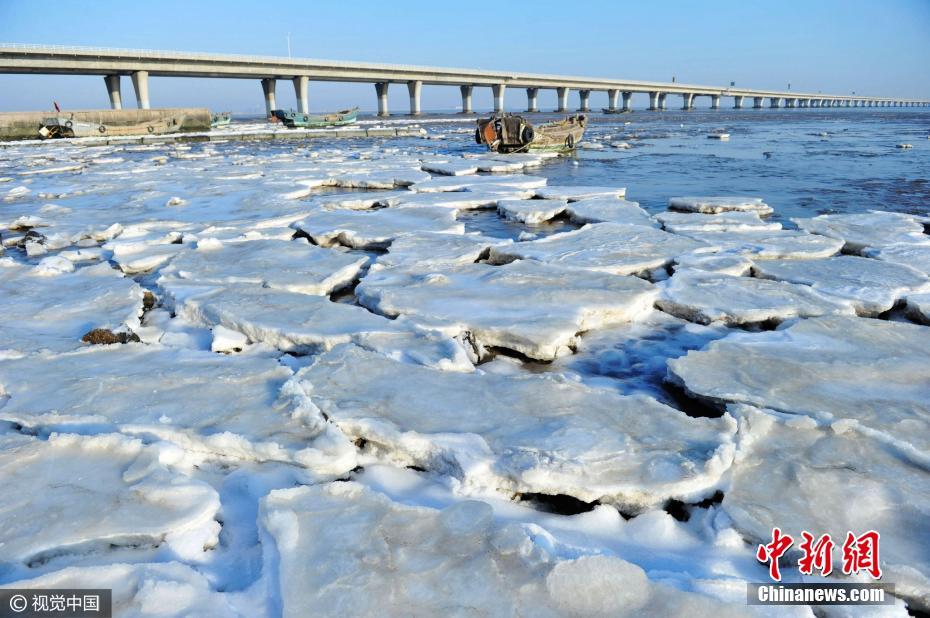 青岛胶州湾海冰再起 厚度超过十厘米
