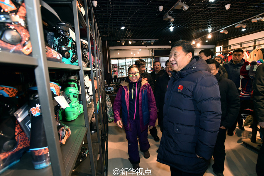 张家口崇礼区云顶滑雪场,习近平走进一家滑雪用具店。他向店员细致询问了头盔、雪服、雪鞋、雪板等滑雪用具的品牌、价格、产地,了解其功能用途和销售情况。商店外的大厅,上百位游客和滑雪爱好者看到总书记来了,簇拥过来,争先恐后同总书记握手,向总书记拜年。习近平亲切问候大家:“新春快乐,祝你们在这里玩得开心!”
