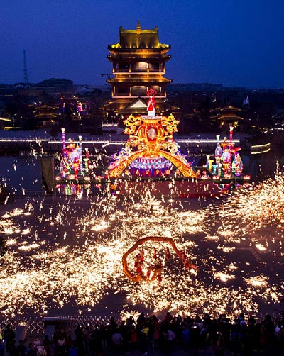 1月21日晚,在山东省枣庄市台儿庄古城,民间表演队为游客表演“火龙钢花”。春节临近,山东省枣庄市台儿庄古城推出“火龙钢花”等非遗节目表演,精彩纷呈。