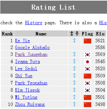 世界职业围棋最新排名:柯洁第一 阿尔法狗第二