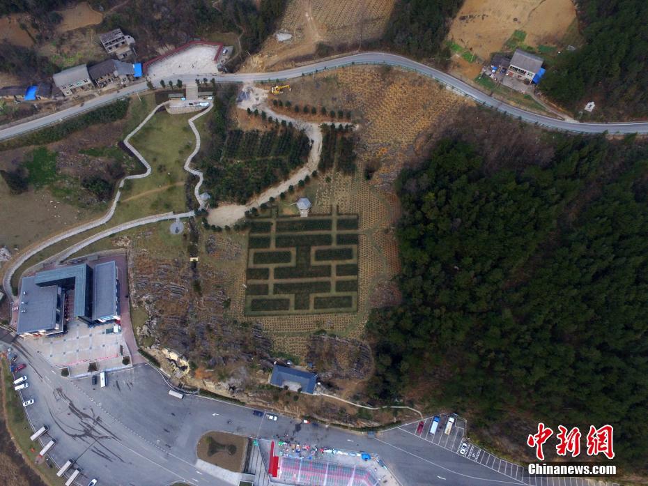 1月23日,在四川省万源市八台山境内,一片山茶花树拼织成一个长宽各50米的巨型“囍”字,以此迎接新春的到来。张浪 摄