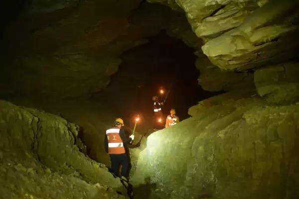 谢小华和徒弟王斌打着火把检查溶洞岩壁
