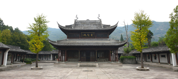 “书圣殿”,金庭观的主殿。殿两旁是书画长廊,以书画形式展示了王羲之的书法作品和相关典故,营造了浓厚的艺术氛围。