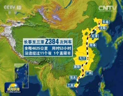 今天新春走基层系列报道《一路回家》,我们将关注一趟我国南北方向最长的旅客列车,长春至三亚的“直384次”列车,它全程4625公里,用时53小时,这一路上,会有些什么故事呢?