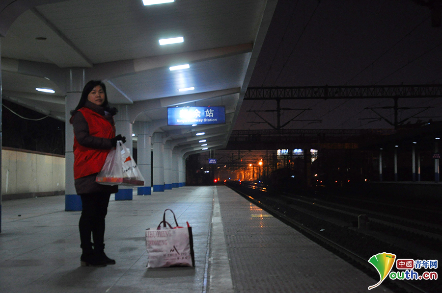 在站台上等待着列车的程妈妈。中国青年网 袁诚 潘哲 摄