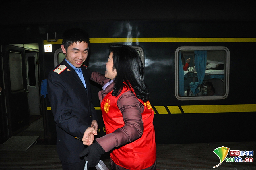 18点23分,k581次列车在站台上停稳。18号车厢走出一位帅气的小伙子,瘦小的身材站在18号车门旁,认真的维持上下旅客的秩序。当程新洲这位特别的乘客出现时,这个不满20的男生微微惊讶,紧张而害羞的低了下头。一声的呼唤,眼泪蓄满眼眶;一个温暖的拥抱,温暖了整个冬季。待旅客上下完毕后,程新洲立即上前给了他一个大大的拥抱,而看到记者,邵杰匀又害羞的低下了头。