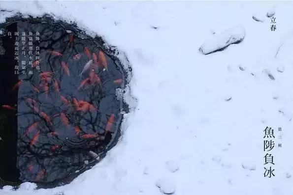 再过五日,河里的冰开始融化,鱼开始到水面上游动,此时水面上还有没完全溶解的碎冰片,如同被鱼负着一般浮在水面。