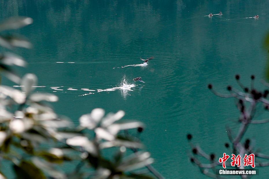 2月4日,一对鸳鸯在石阡县鸳鸯湖起飞。石阡鸳鸯湖是中国最大的野生鸳鸯越冬栖息地,2011年被授予“国家湿地公园”称号。中新社记者 贺俊怡 摄